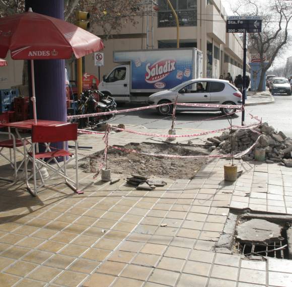 Tras la queja de comerciantes sobre la vereda que se hundía en Avenida Rioja y Santa Fe y que publicó ayer DIARIO DE CUYO, la Municipalidad de la Capital comenzó a repararla. Sacó las baldosas y valló el sector para evitar caídas, una de las preocupaciones que generaba la depresión del terreno.