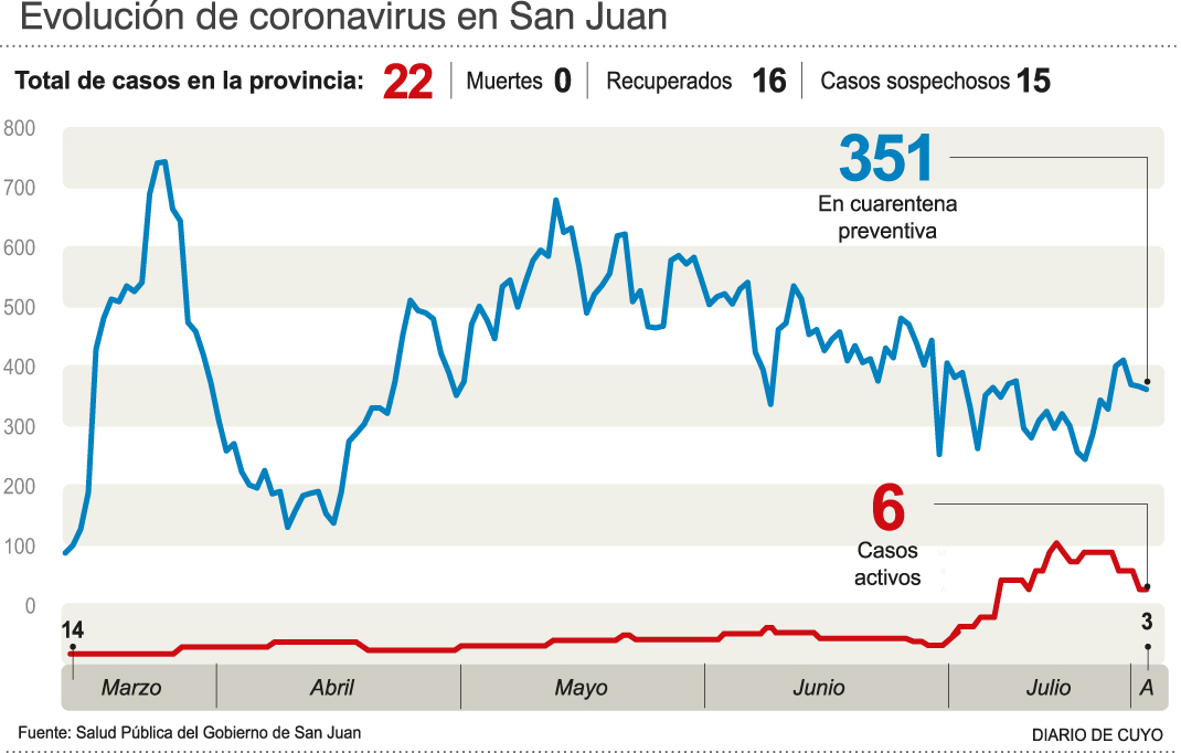 Sin casos nuevos, Salud Pública anunció ayer que San Juan mantiene un acumulado de 22 positivos, de los cuales 6 tienen proceso infeccioso; en tanto que hay 15 casos sospechosos. A su vez, Mónica Jofré, jefa de Epidemiología, instó a no confundir "flexibilizar con relajación".
