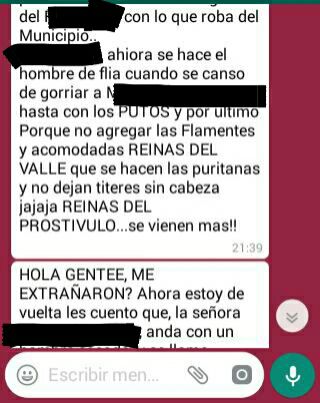 En otro de los envíos, el autor de los mensajes se refiere también a los hombres y no deja de lado ni a las representantes departamentales en distintas fiestas a las que llama “Reinas del Valle”. Luego, apunta por robos y estafas contra personal del municipio.