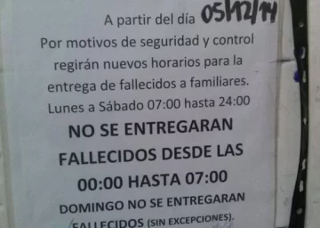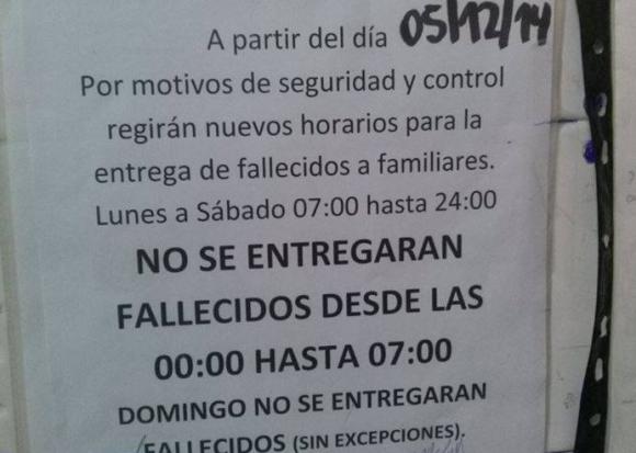 �El cartel que pegaron en la Morgue del Marcial Quiroga y que indicaba que la entrega de cadáveres no se iba a realizar de madrugada, ni domingos, levantó polvareda en las redes sociales. El director el hospital, Enzo González Iaiza, dijo que no se dio esa orden y que el empleado que colocó el cartel pidió disculpas, por lo que no será sancionado.