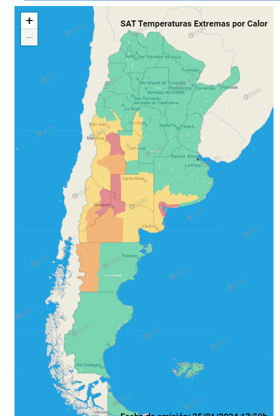El Servicio Meteorológico Nacional (SMN) emitió alerta roja por temperaturas extremas en cinco provincias. Las zonas que se verán afectadas son: sur de Buenos Aires, noroeste de Río Negro, este de Neuquén, oeste de La Pampa y noreste de Mendoza. Chubut también presenta una alerta naranja por altas temperaturas, mientras que para San Juan, San Luis y Córdoba rige alerta amarilla.