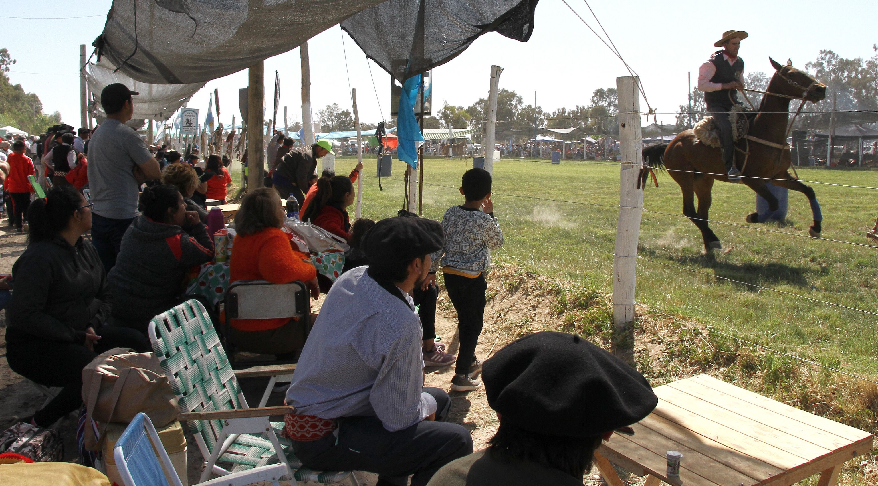 Desde antes de las 9 el predio comenzó a tomar color de festival. Los gauchos con las mejores pilchas y los caballos, brillantes, decoraron el predio. Los primeros en llegar dijeron ser los más ansiosos. "Decidimos venir bien temprano para poder estar cómodos y tener una buena ubicación para ver todo. Hoy no queremos perdernos de nada, porque hace más de un año que no estamos en un evento como este. Vine con mi familia porque nadie quiso quedarse fuera de la fiesta", dijo Walter Bustamante, un gaucho de 25 de Mayo que llegó hasta con sus bisnietos.