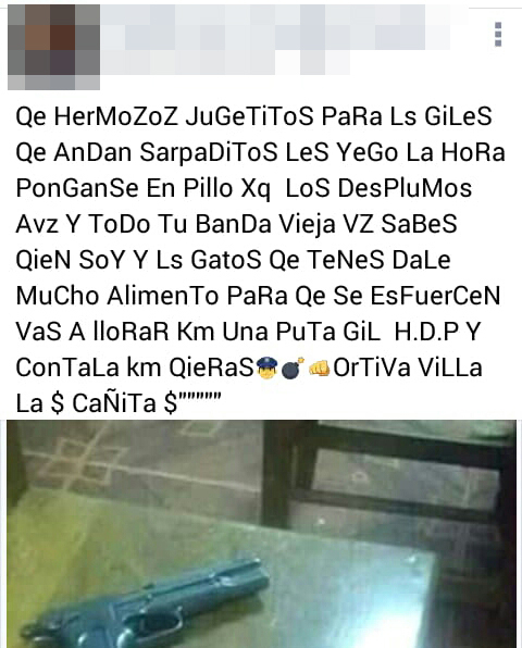 No conformes, publicaron un escabroso y desafiante mensaje en las redes sociales. "Qe hermozoz jugetitos para ls giles qe andan sarpaditos les yego la hora ponganse en pillo xq los desplumos avz y todo tu banda vieja vz sabes qien soy y los gatos qe tenes dale mucho alimento para qe se esfuercen", escribió uno de los sujetos que es intensamente buscado.