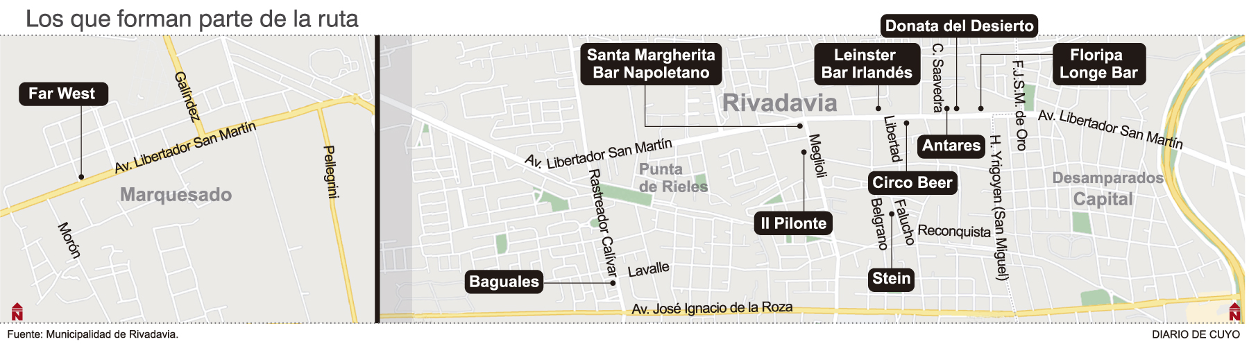 En la previa de las vacaciones de invierno y en el contexto de la pandemia, la Municipalidad de Rivadavia lanzará oficialmente hoy la Ruta de la Cerveza. Se trata de una nueva propuesta turística gastronómica para que sanjuaninos y turistas de otras provincias conozcan el departamento. "Además de incentivar el turismo, la idea es apoyar a los emprendedores de Rivadavia. Esto, teniendo en cuenta que vienen de un año muy complicado. Se pensó en una propuesta turística innovadora y como tenemos muchos bares y productores de cervezas artesanales, pensamos en esta ruta", dijo el intendente de Rivadavia, Fabián Martín, y explicó que la mayoría de los locales de este circuito se encuentra en Avenida Libertador, desde calle San Miguel hasta Marquesado (ver infografía).