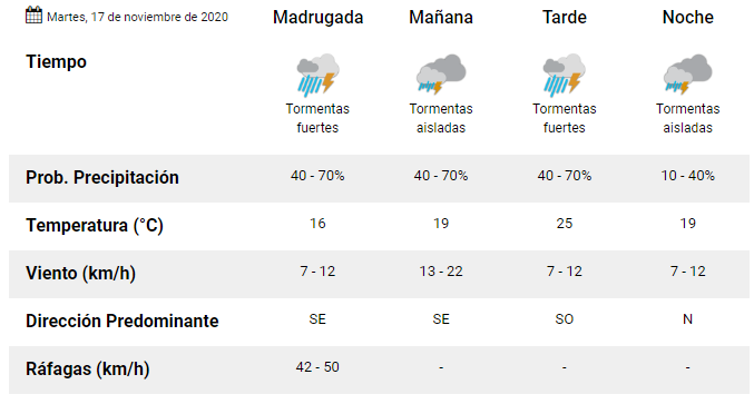 Un alerta emitido por la Dirección de Protección Civil de San Juan y el pronóstico que entrega el Servicio Meteorológico Nacional plantea un escenario de fuertes tormentas y caída de granizo para la noche de este lunes y la madrugada del martes. A esto se le agrega la ocurrencia de fuerte viento del cuadrante Sur.
