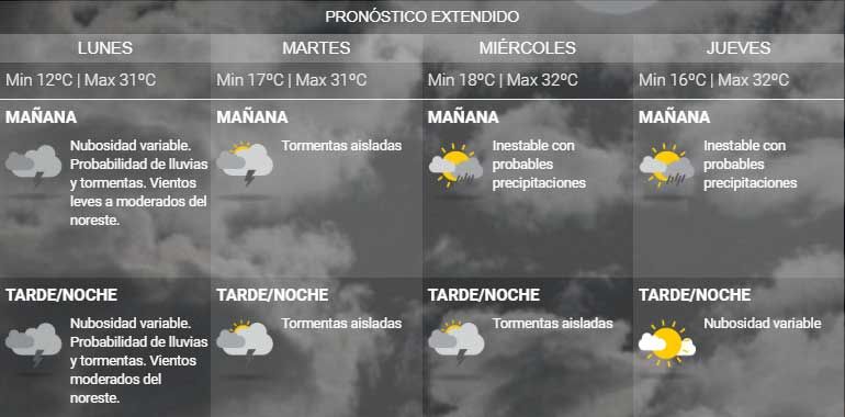 El Servicio Meteorológico Nacional anuncia cuatro días de lluvias para la provincia con temperaturas máximas que se ubicarán entre los 31 y 32 grados.