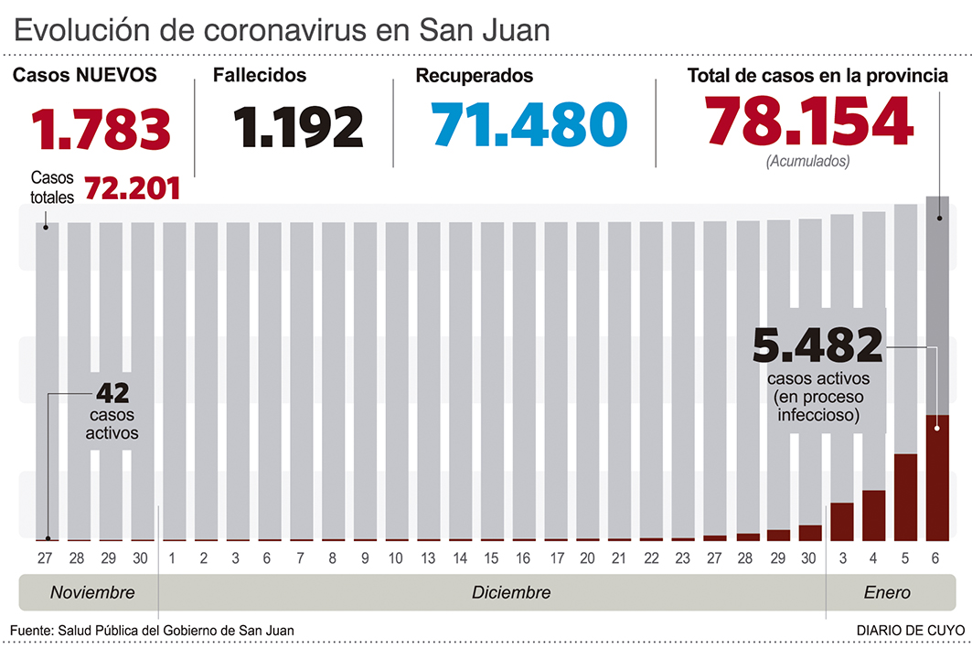 Tras el salto histórico de contagios de coronavirus en un mismo día que se registró el miércoles pasado en San Juan, ayer esa marca volvió a ser superada, con los 1.783 casos que informó Salud Pública. Además, falleció una mujer de 74 años, oriunda de Rawson, que estaba internada en el M. Quiroga.