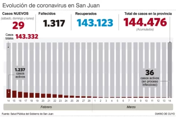 Salud Pública reportó ayer que entre sábado y ayer no hubo decesos; a la vez que detectaron 29 nuevos casos, con la particularidad que 7 de ellos fueron confirmados entre domingo (5) y lunes (2). De esta manera, en el acumulado hay 144.476 infectados. Los casos activos son 36, mientras que hay 4 internados.