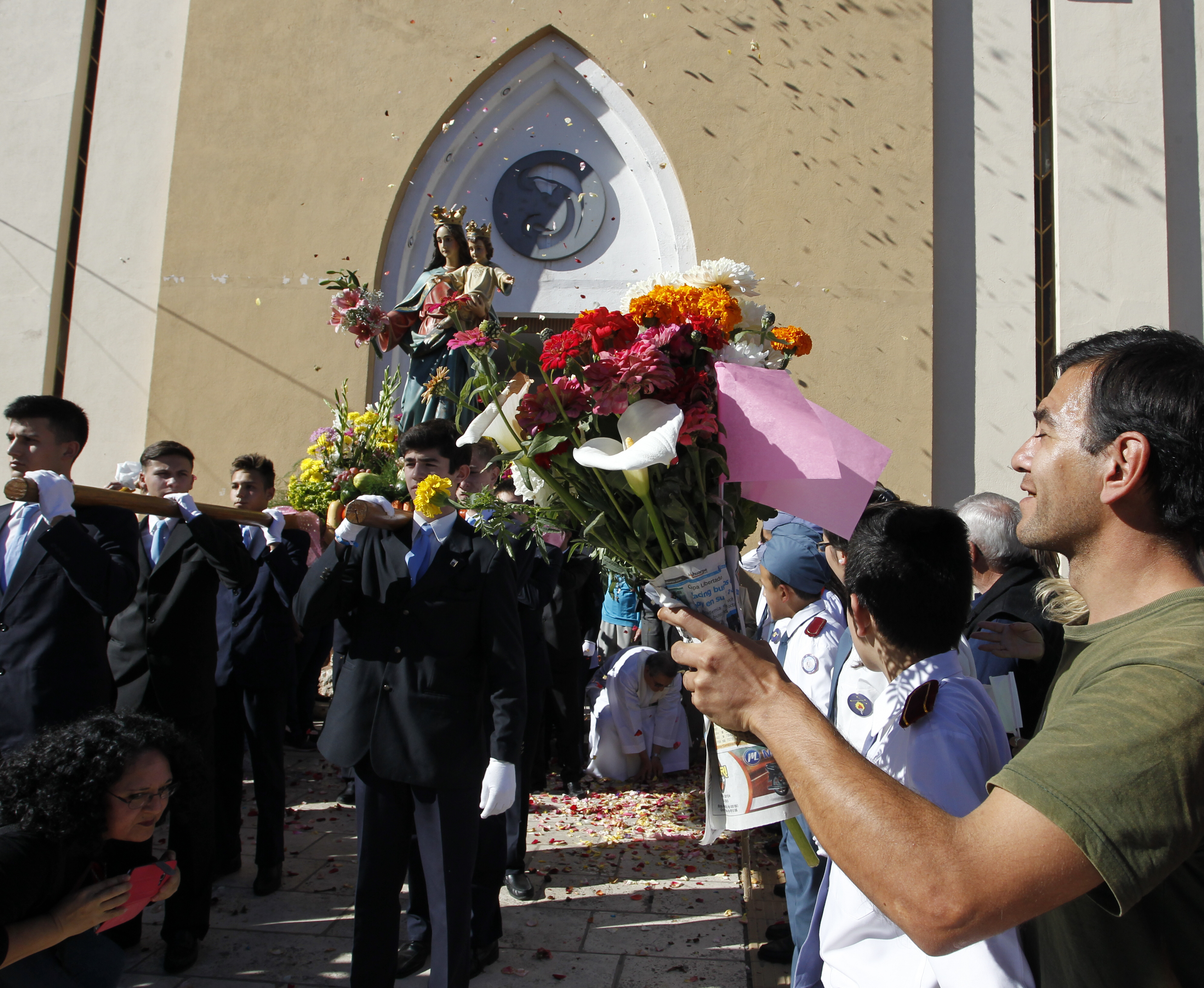 Si bien hubo padres que tuvieron que explicarles a sus pequeños que eran caracterizaciones, la celebración alcanzó todavía un pico superior cuando entró la imagen de María Auxiliadora. Una multicolor lluvia de papeles y flores, bombas de estruendo, mil banderitas azul, rosado y blanco, y aplausos más fuertes todavía dieron el marco de celebración a una procesión que tuvo su novedad.