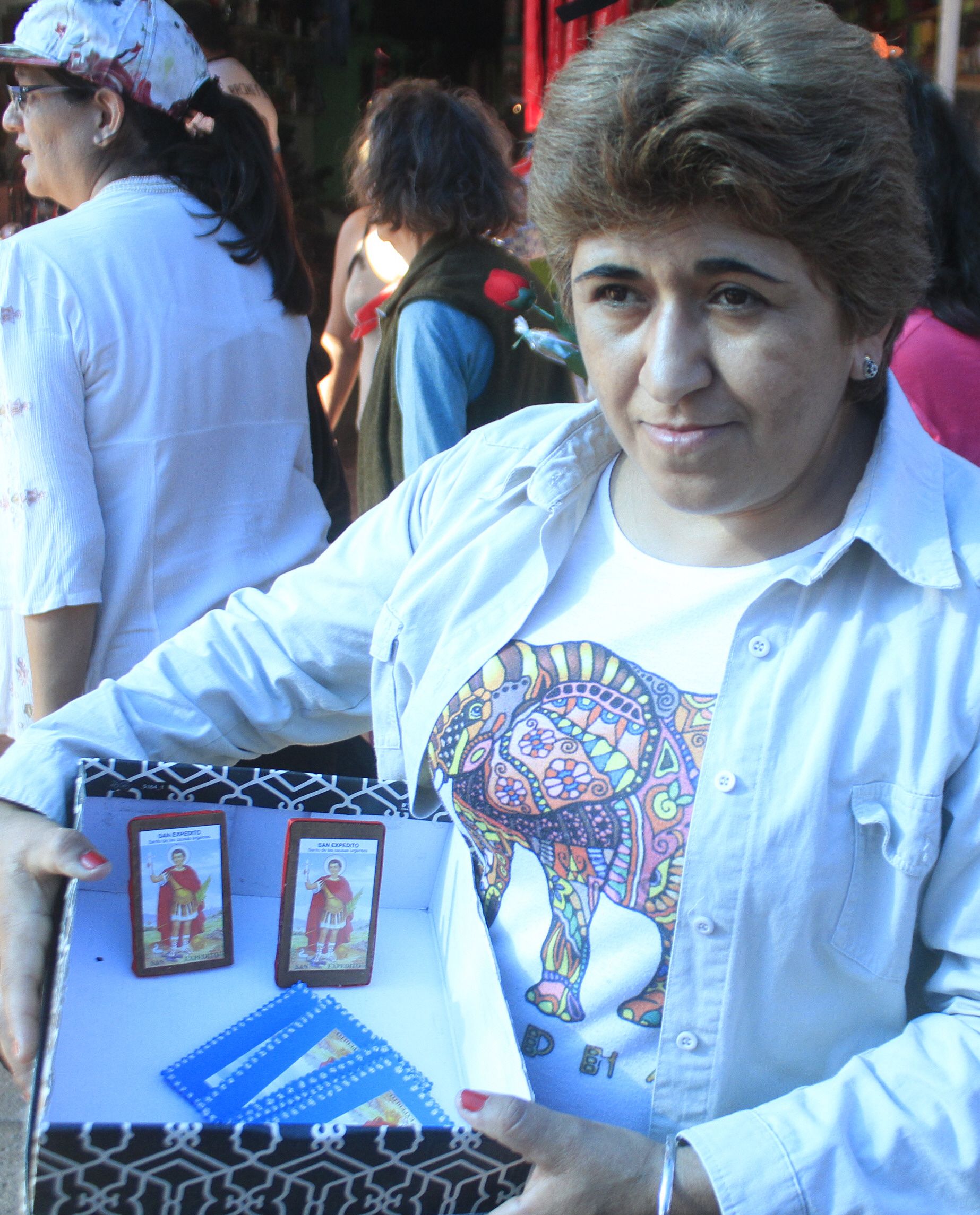Victoria Méndez sorprendió a los fieles en San Expedito. Con una caja llena de estampitas y cuadritos del santo se ganó la admiración de muchos. Es que ella, juntos a sus hijas, hizo estampitas decoradas y algunos recuerditos de madera para regalarles a los fieles que visitaron el pueblo caucetero. Esto lo hizo con el fin de agradecer una promesa cumplida. Si bien no quiso dar mayores detalles sobre qué le pidió al patrono de las causas urgentes, dijo que le va estar agradecida toda la vida. “Esto que hago es un regalo para que todos lo recuerden. Es un santo muy especial en mi vida”, dijo Victoria que es de Pocito y que llegó a Bermejo en la mañana temprano para repartir sus regalos. A los pocos minutos se quedó sin estampitas para obsequiar.