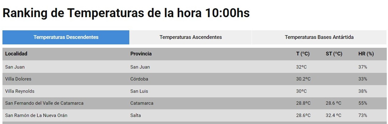 Mientras el Servicio Meteorológico Nacional anuncia una jornada agobiante con una máxima que llegará a los 38 grados, San Juan lidera desde las 8 de la mañana el ranking de altas temperaturas elaborado por el organismo.