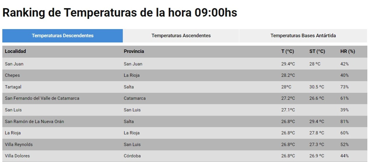 A las 9 de la mañana, la provincia estaba en el primer puesto con 29.4 grados, seguido por la localidad riojana de Chepes con 28.2 grados.