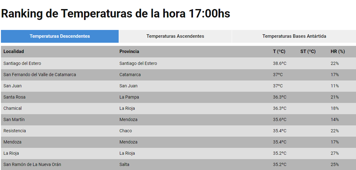 El ranking de temperatura, que toma registros de las distintas estaciones meteorológicas del país, advirtió que a las 17 las ciudades más cálidas del país eran la capital de Santiago del Estero (38.6º), en tanto que San Juan y San Fernando del Valle de Catamarca completaron el podio con 37 grados.