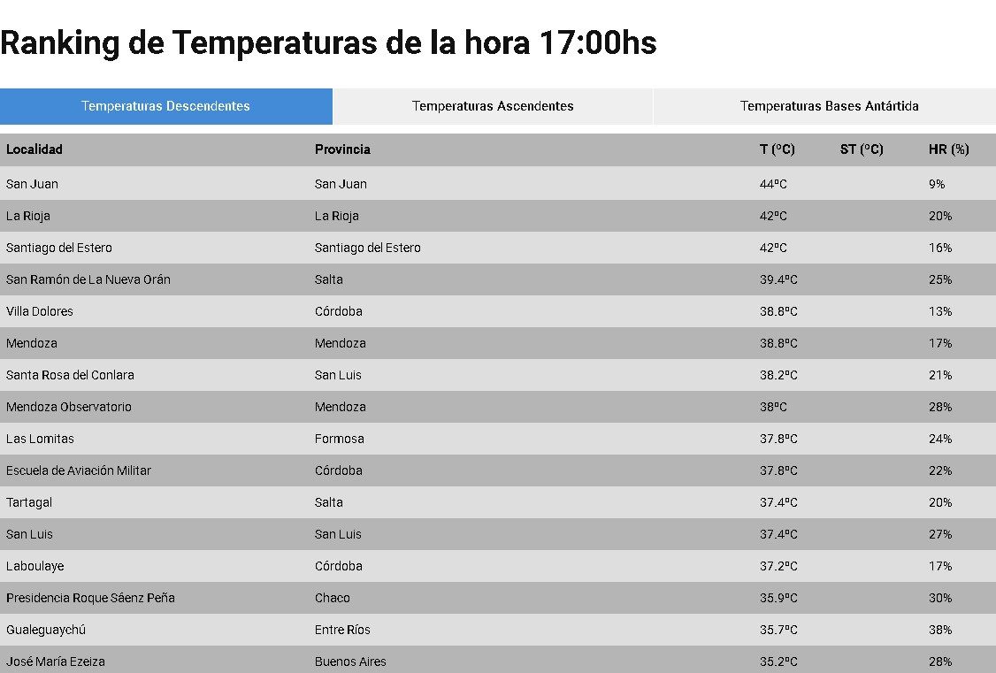 Según los datos reflejados por el Servicio Meteorológico Nacional, con la temperatura registrada a las 17 de este jueves, San Juan ocupó el primer puesto en el ranking de calor del país.
