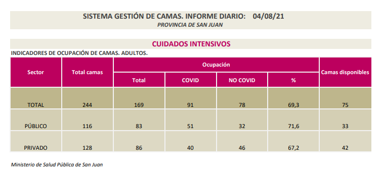 Además, sencuentran internados 178 pacientes en las áreas de COVID-19 (entre positivos y sospechosos) de los hospitales Dr. Guillermo Rawson; Dr. Marcial Quiroga; Dr. Ventura Lloveras, de Sarmiento; Dr. César Aguilar, de Caucete; Dr. José Giordano, de Albardón; Dr. Federico Cantoni, de Pocito; CEMEC; Dra. Julieta Lanteri; Hospital San Roque, de Jáchal; Hospital Dr. Alejandro Albarracín, de Valle Fértil; Hospital de Barreal, de Calingasta; Hospital Privado; Instituto Médico; Clínica El Castaño; Clínica Santa Clara; Sanatorio San Juan y CCI.