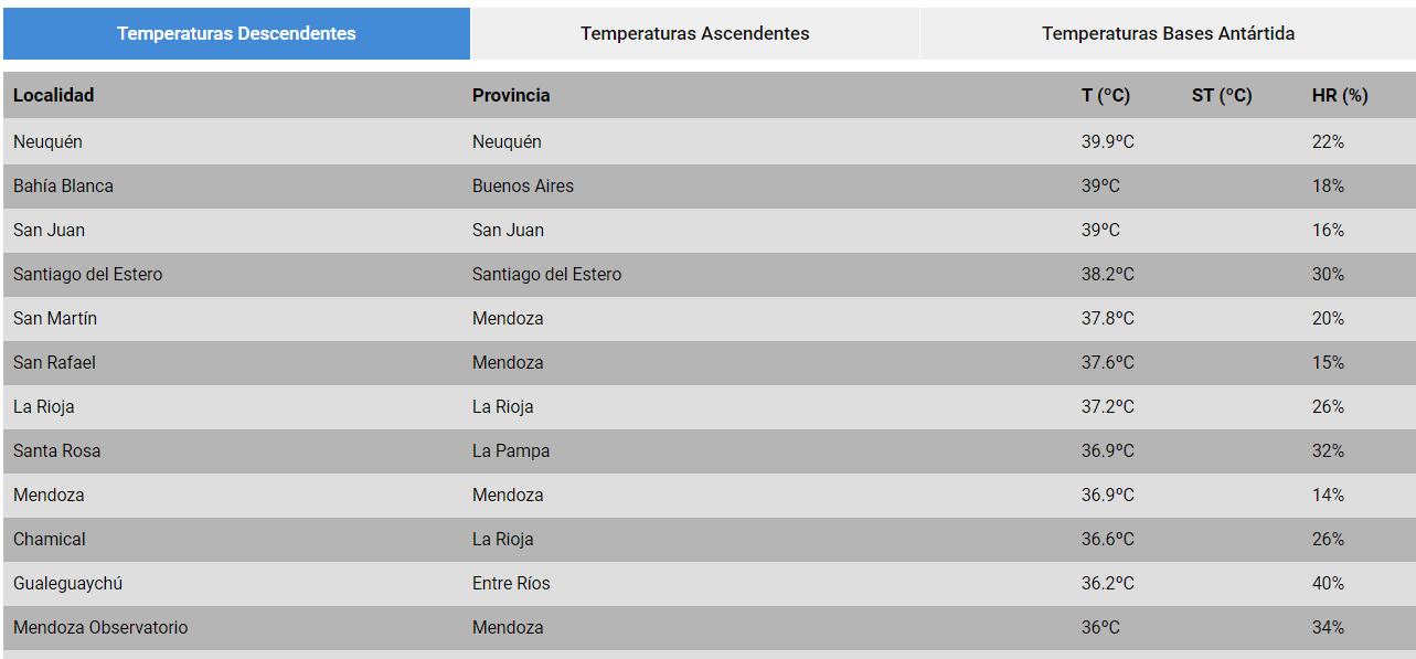 Pero ese tope se superó a las 17, el termómetro subió hasta los 39°C colocándose entre las más calientes de Argentina. Liderando el ranking estuvo Neuquén con 39,9 mientras que Bahía Blanca (Buenos Aires) se ubicó segunda con 39°C.