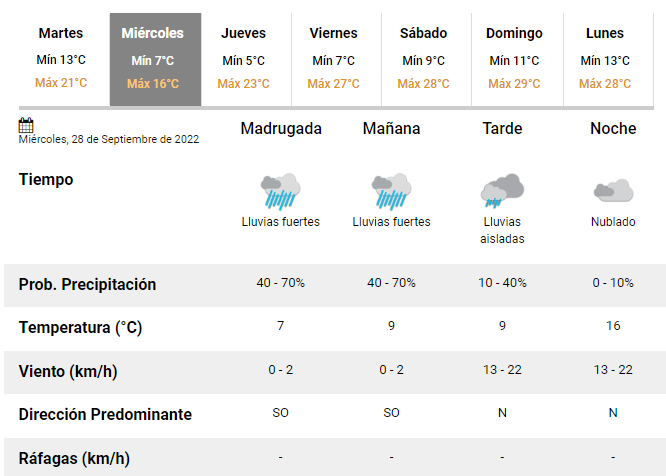 En cuanto a mañana miércoles, se prevé una temperatura mínima de 7 grados y una máxima de 16. Con lluvias fuertes durante la madrugada y la mañana. Mientras que, por la tarde el fenómeno podría continuar con precipitaciones aisladas.