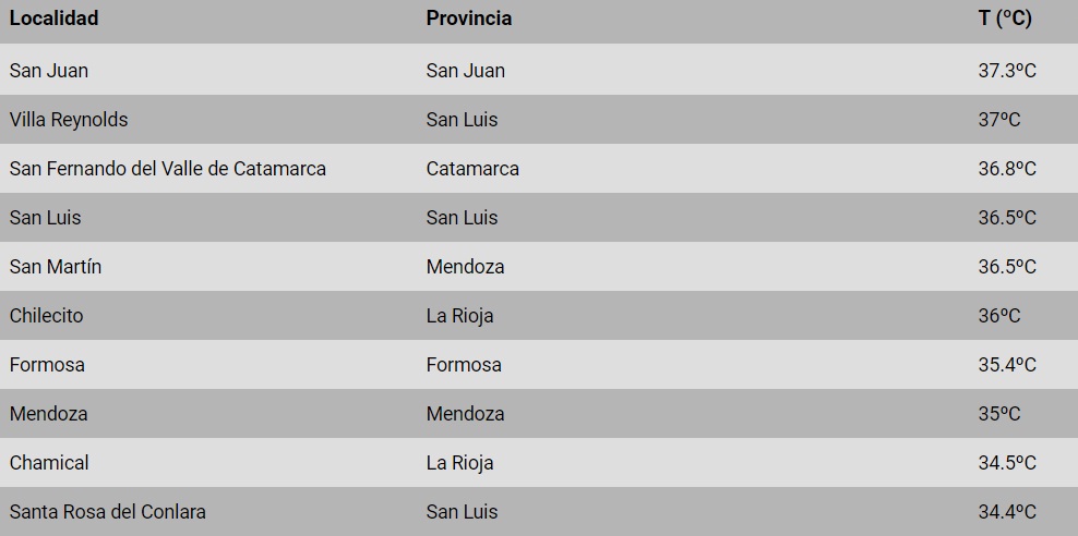 Villa Reynolds de San Luis con 37°C se ubicó segunda y San Fernando del Valle de Catamarca con 36.8°C cerró el podio. Se espera que hasta las 18, en San Juan, los grados continúen en aumento.