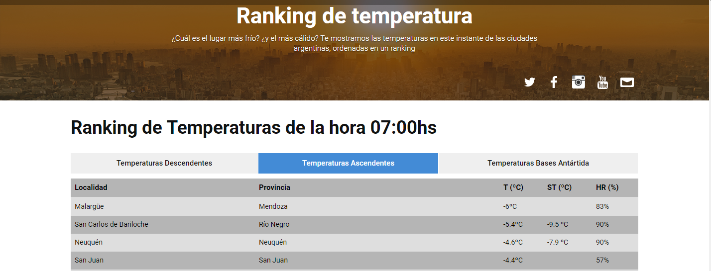 A esa hora, la menor temperatura de Argentina era registrada en el departamento mendocino Malargüe, -6 grados. Mientras que, la segunda en orden fue San Carlos de Bariloche, en Río Negro, donde el termómetro marcaba -5.4 grados. En tercer lugar se ubicó la ciudad de Neuquén, con -4.6 grados y luego quedó la Ciudad de San Juan.
