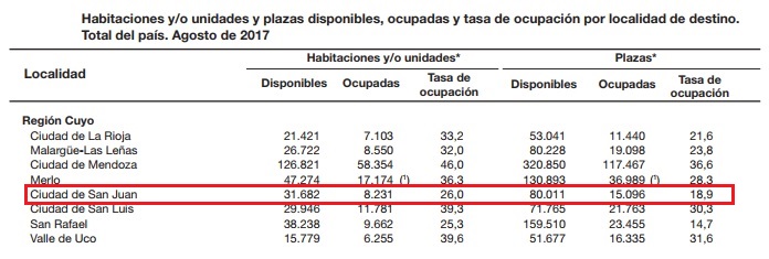 San Juan cuenta con más de 80 mil camas disponibles en hoteles de 1, 2, 3, 4 y 5 estrellas, apart hoteles y boutiques, de las cuales fueron ocupadas 15 mil, convirtiéndose en el porcentaje más bajo de Cuyo, solamente por encima de San Rafael (Mendoza) con el 14,7%.