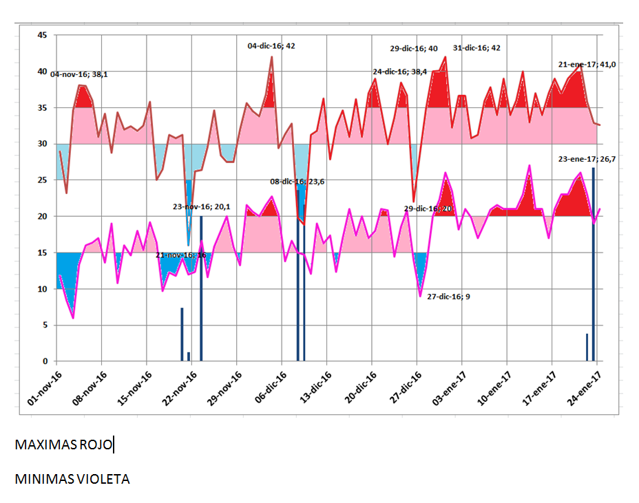Poblete informó además que lo característico de estas masas es que no sólo suben la temperatura máxima, sino que también generan un aumento en las mínimas. “En este periodo, sólo en ocasiones excepcionales el termómetro ha bajado de 20 grados y ha habido seguidillas de mínimas que no bajaron de los 25 grados”, detalló el especialista.