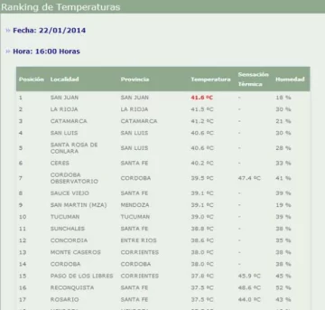 San Juan, 22 de enero.- Por tercera vez en menos de siete días, San Juan volvió a liderar el ranking de las provincias más calurosas del país del Servicio Meteorológico Nacional. Según los registros proporcionados por el SMN, a las 16 horas superó la máxima pronosticada de 38° y alcanzó los 41,6° con un 18% de humedad. Le siguieron en segundo lugar, La Rioja con 41,5°y una humedad del 30% y Catamarca con 41,2° y 21% de humedad, en tercero.