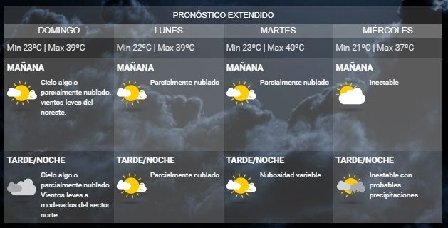 Según el SMN, este domingo y lunes la máxima llegará a los 39 grados mientras que el martes subirá hasta alcanzar los 40 grados. El miércoles ascenderá hasta los 37°C.