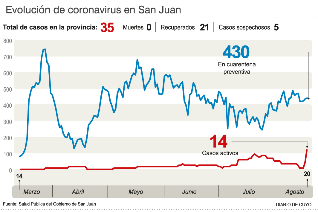 Así, San Juan tiene 35 casos de coronavirus, 14 de los cuales atraviesan proceso infeccioso. Entre estos últimos, hay cuatro internados y dos se encuentran en estado crítico (un hombre de 74 y otro de 81 años).