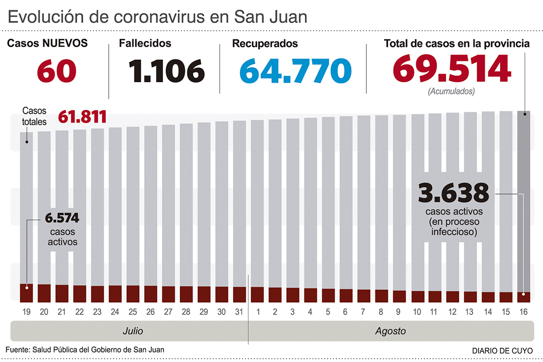 San Juan lleva 11 semanas consecutivas con baja de casos de coronavirus. Según las autoridades provinciales esto se debe en gran medida al "buen ritmo" de vacunación que tiene la provincia. En este contexto, dijeron que desde Nación pidieron a todas las provincias que terminaran agosto con al menos el 60% de las personas mayores de 50 años inmunizadas; y San Juan ya superó esa meta. "Nos propusieron alcanzar un porcentaje y nosotros ya estamos por arriba de esa cifra. Es decir, que vamos a terminar un buen mes, porque aún nos quedan casi 15 días", dijo Marita Sosa, la jefa de Inmunizaciones y comentó que el 61,5% de este grupo etario ya está inmunizado.