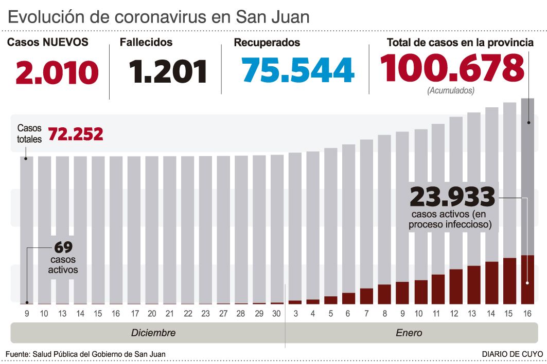 Los datos informados por el Ministerio de Salud indican que, desde el desembarco de la enfermedad y a lo largo de 20 meses en los que se registraron dos olas de covid, San Juan sumó 72.433 contagios (es decir, 113,5 promedio por día). Mientras que los 28.245 restantes se dieron en sólo 22 días, con la tercera ola a partir de Navidad (una media diaria de 1.284 casos).