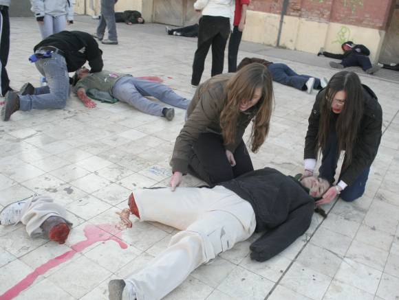 Los alumnos que cursan Medicina, en la Universidad Católica de Cuyo, fueron los encargados de representar a los heridos. A la hora de iniciar el simulacro ya estaban acordes a la situación. Sus caras mostraban excoriaciones de distinto grado y sus piernas estaban hinchadas producto de los golpes. Ni bien llegó el equipo de emergencia clasificaron a los heridos por colores, ante el grito desgarrador de los que estaban más graves. El rojo fue para los que necesitaban ayuda de inmediato, porque su vida estaba en riesgo; el amarillo para los de gravedad media, y el verde para los que estaban bien. Del simulacro también participó Bomberos y el personal de Sifeme que fue el encargado de explicar cómo se levantan los heridos.