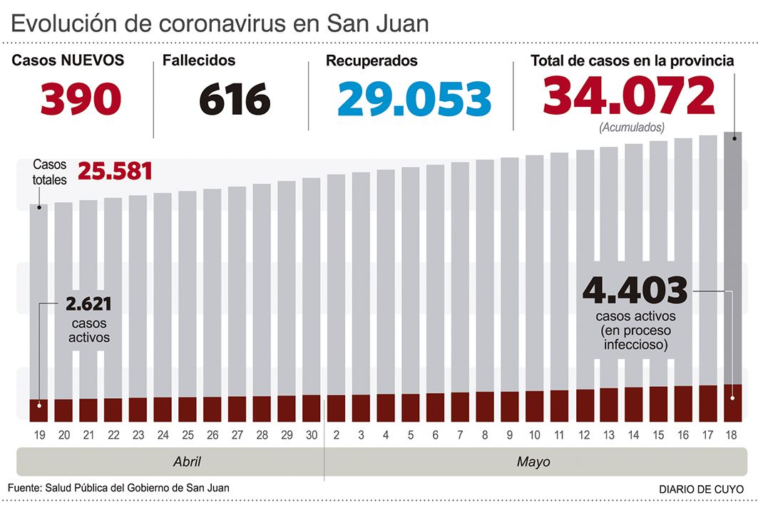 Hasta el 15 de abril pasado, Sarmiento agrupaba al 1,21% del total de casos en San Juan, es decir, unos 300 infectados en el acumulado. Y en casi un mes saltó al 2,08%, es decir, unos 672 sarmientinos contagiados. La brecha fue nada menos que de 124%, para convertirse en el departamento donde porcentualmente hubo mayor crecimiento de casos.