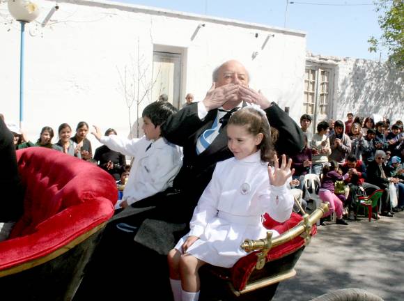 Mientras se abría camino en el mateo (conducido por el gaucho Paco Costa, quien de inmediato se autodefinió como el "chofer de Sarmiento"), saludaba parsimonioso a las tropas del RIM 22 y a los policías que comenzaban a alinearse para el desfile. Devolvía besos y agite de manos y, ya listo para empezar la marcha, daba consejos a los niños que se acercaban.