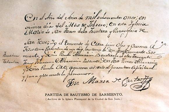 En cuanto a su nacimiento, en el acta de bautismo dice: “Faustino Valentín de un día, legítimo de Don José Clemente Sarmiento y Doña Paula Albarracín. Padrinos Don José Tomás Albarracín y Doña Paula Oro”. En el encabezado de la partida consta que es el 15 de febrero de 1811, pero más adelante, el cura que lo bautizó, aclara que el niño tenía un día de vida.