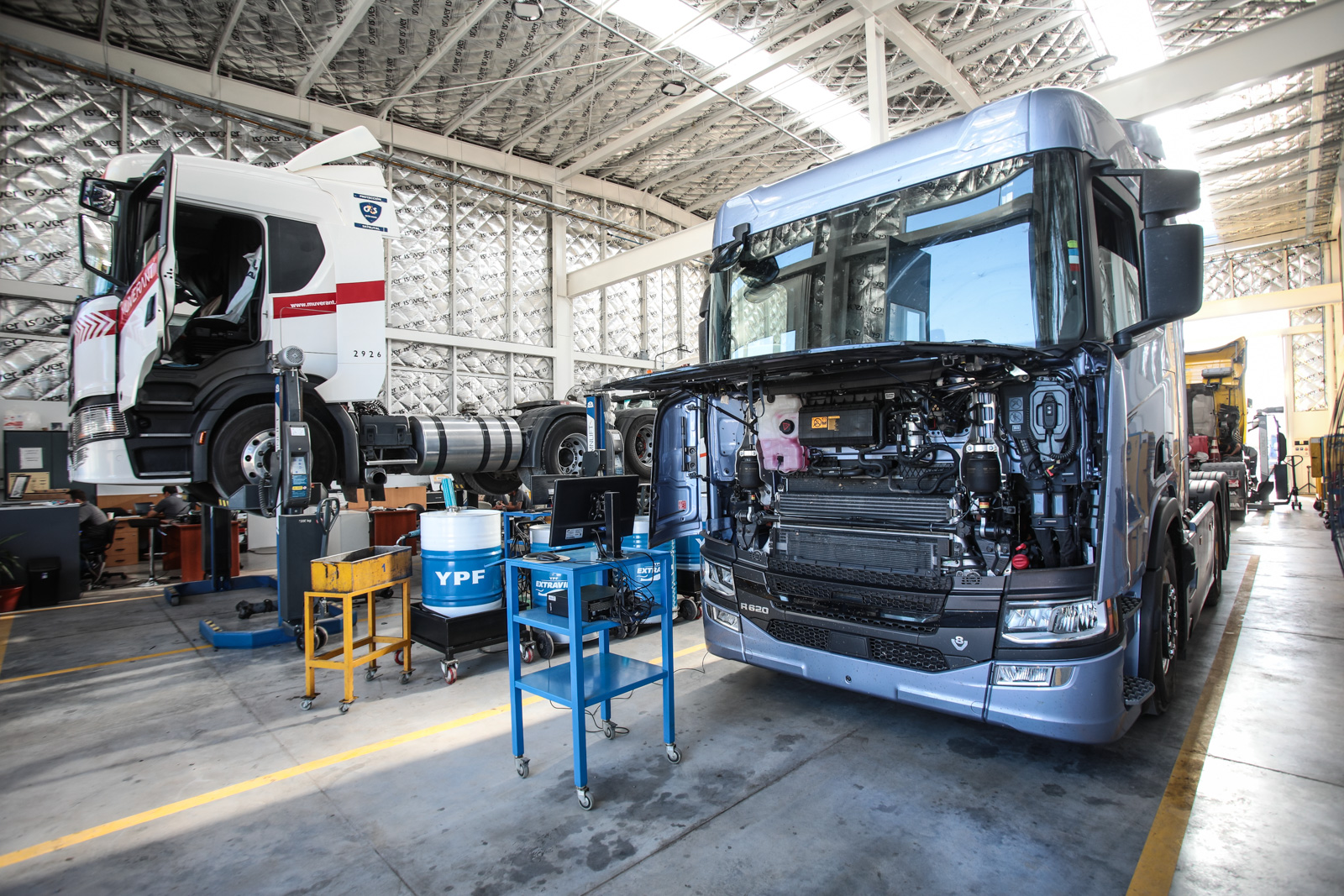 La nueva sucursal, que ocupa un total de 900 m2, cuenta con guardia, sala de choferes, sanitarios, oficinas, depósito, estación ambiental y taller. En este espacio se distribuyen tres áreas de servicio y un área de componentes, dispuestos de forma lineal, lo cual permite atender a más de un camión en simultáneo de manera segura y sin riesgo de accidentes. En el concesionario trabaja un equipo de 10 personas, compuesto por 5 técnicos, personal de servicios, personal de ventas y un responsable de sucursal.