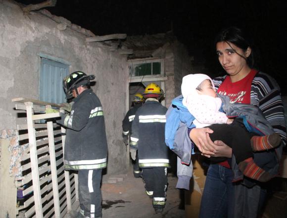 ”Mi hijo acababa de llegar de la escuela y yo le estaba dando la teta a la bebé cuando sentí que los palos empezaron a crujir cada vez más fuerte. Entonces, mi marido tomó a los niños y salimos. En ese instante el techo se desplomó por completo”. Así describió Jésica Pereira la odisea que pasó ayer por la tarde cuando el techo de su casa se desplomó. Fue porque había quedado dañado por el temblor del miércoles por la noche. Esto sucedió pasada las 18 e intervino Bomberos Voluntarios de Chimbas para sacar los escombros. El municipio asistió a la familia para que no pasara la noche a la intemperie.