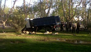 San Juan 18 de septiembre.- Que un vehículo quede enterrado en la arena o en un lugar de complejo acceso, es algo común. Pero que suceda en el medio del Parque de Mayo, transforma el hecho en algo inusual. Esta tarde personal de la Dirección de Arquitectura, repartición que tiene a su cargo el mantenimiento del espacio verde, intentaba recoger las ramas que quedaron tras realizar la poda en algunos árboles, ingresaron un camión al espacio verde y se les enterró por completo en el barro.