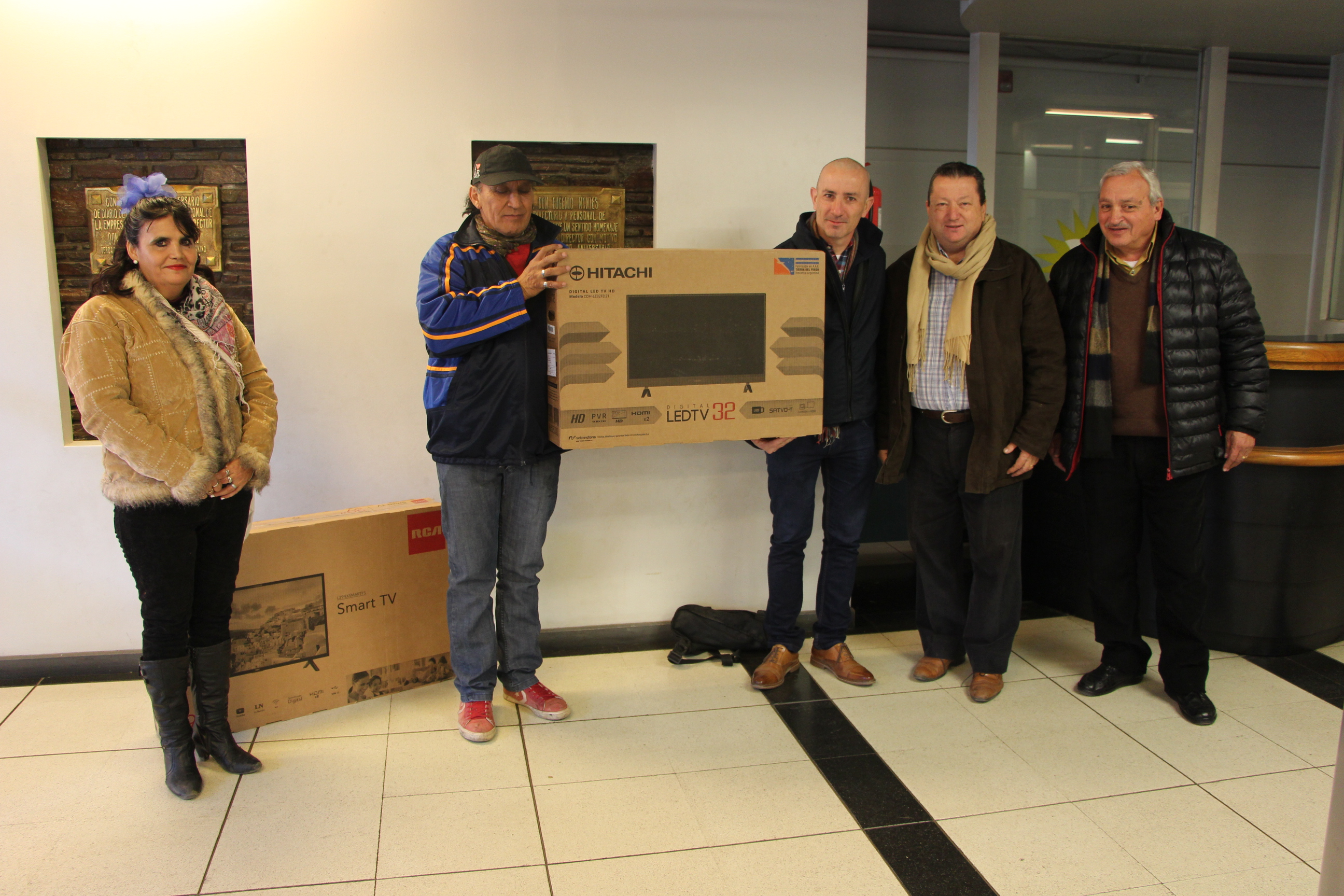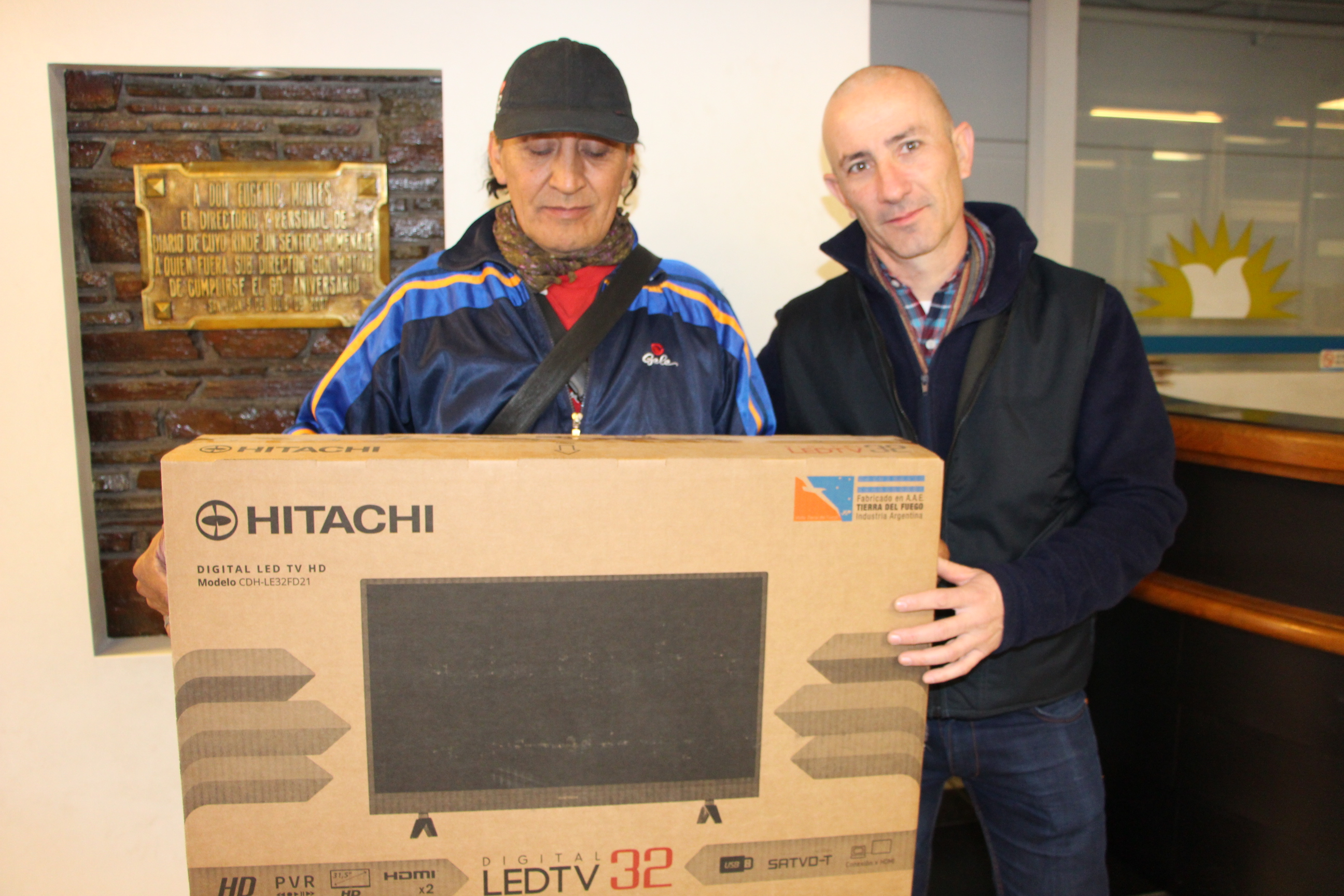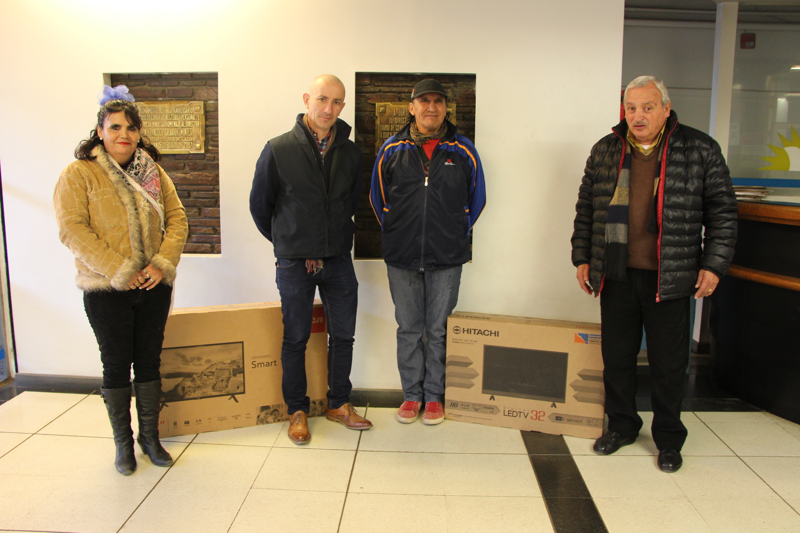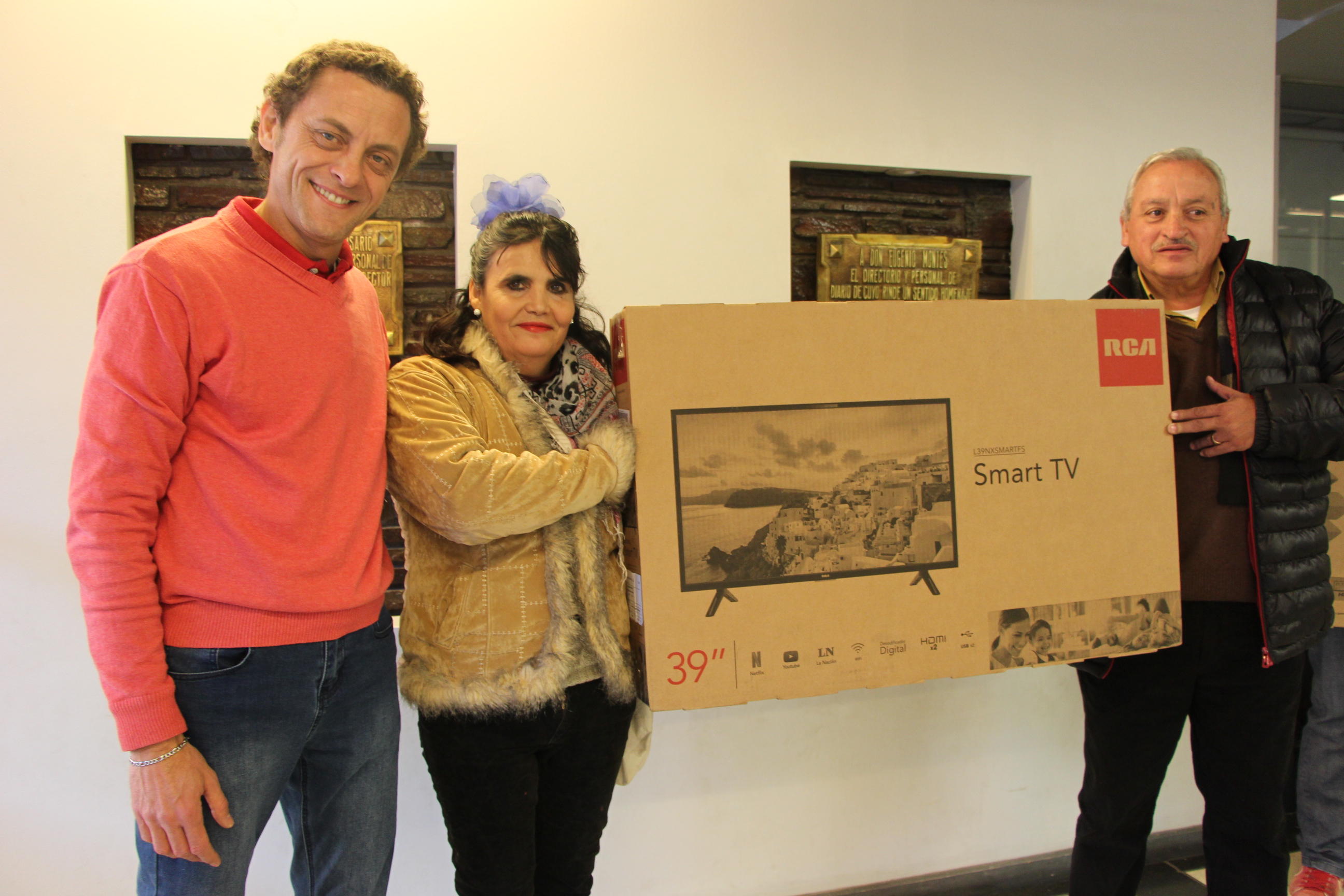 Andrés Montes, director Comercial de Diario de Cuyo y Alfredo Ontiveros, gerente de Dismar, le entregan el TV 39" a Gladys Romero