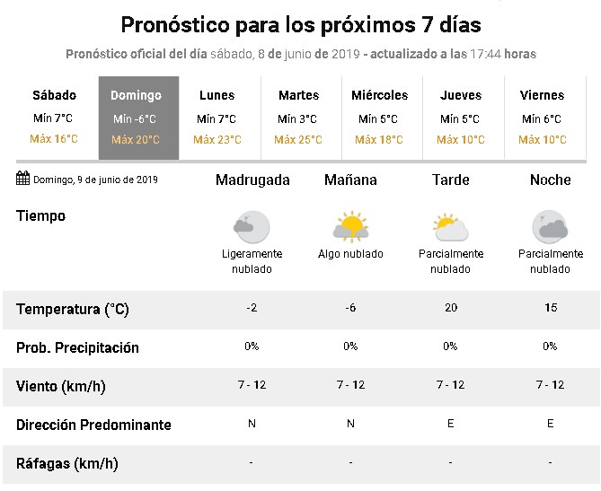 El Servicio Meteorológico Nacional indica que este domingo empezará muy frío, con una temperatura de -6 grados, pero tendrá una tarde en la que la máxima alcanzará los 20 grados, con cielo parcialmente nublado.