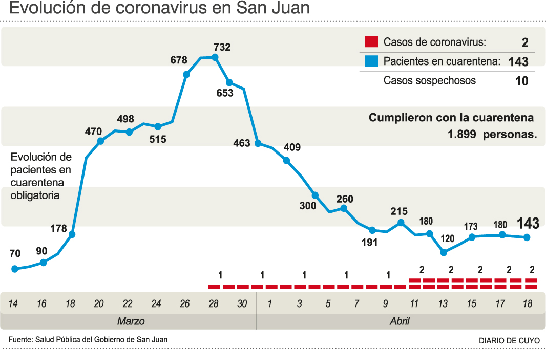 El parte de prensa difundido ayer, cerca de las 20, informó que además de que San Juan mantenía la cantidad de casos positivos, había 143 personas que permanecían en cuarentena. Además, dijeron que la cantidad de gente que ya terminó con este periodo de aislamiento es de 1.899.