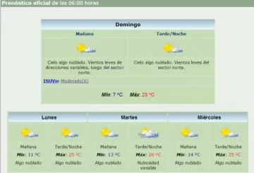 San Juan, 14 de Abril.- El Servicio Meteorológico Nacional pronostica para la jornada de hoy una temperatura máxima de 23 grados, con el cielo algo nublado y vientos leves de direcciones variables rotando hacia el norte por la tarde.