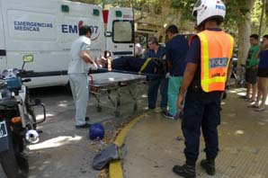 Maria Isnelda Ortíz, de 62 años, no paraba de gritar en la vereda mientras un policía y la ambulancia la asitían. Según relató la mujer, el golpe se produjo cuando bajó del cordón y resbaló, golpeando su cadera contra elcemento. Fue trasladada al Hospital Rawson.