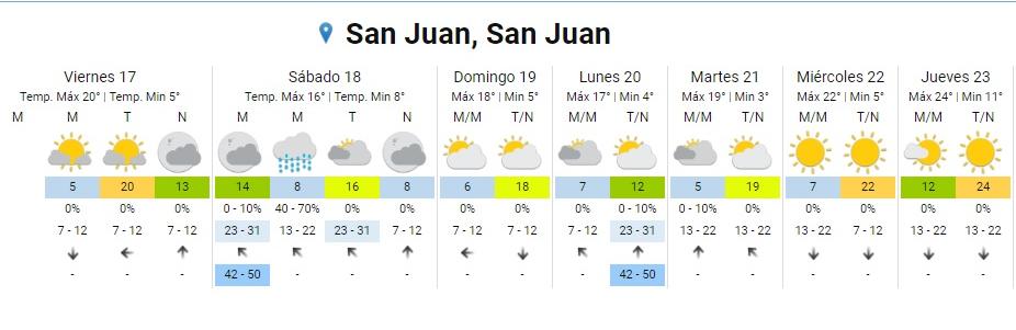 Nubes, algunas lluvias y una temperatura que no alcanzará los 20 grados es lo que anuncia el Servicio Meteorológico Nacional para los próximos 4 días en San Juan.