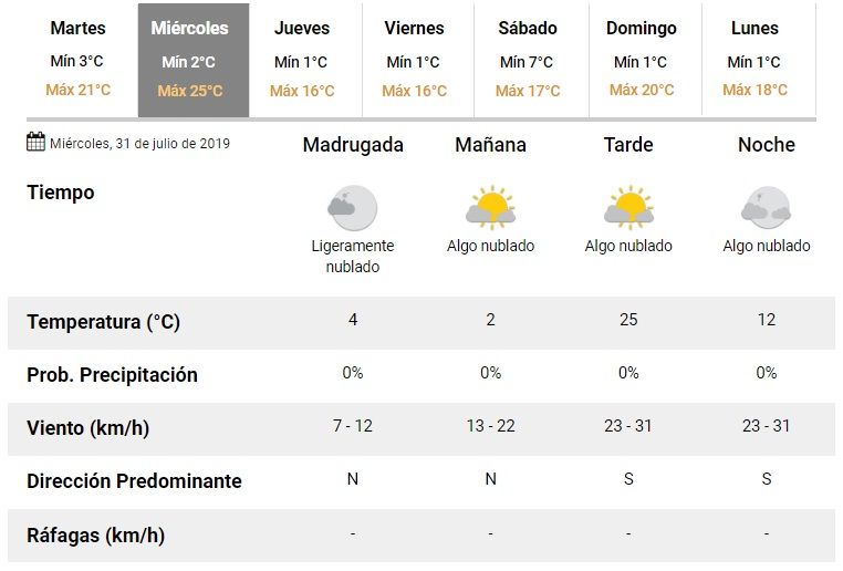La jornada se presentará con cielo algo nublado y vientos del sector norte, en la mañana, rotando hacia el sur por la tarde-noche.