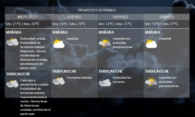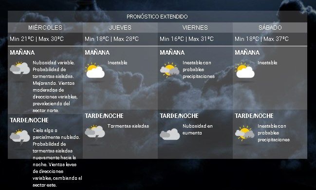 Según el Servicio Meteorológico Nacional, habrá vientos moderados del sector Norte, con nubosidad variable y la probabilidad de tormentas aisladas. Mientras que para la tarde/noche los vientos cambiarán en dirección al este. La humedad rondará el 40%.