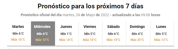 En cuanto al jueves, la temperatura mínima será de 1 grado y la máxima llegará a los 14 grados.