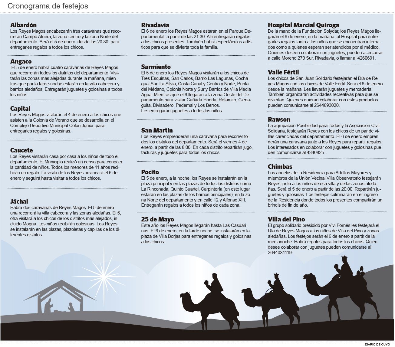 El próximo 6 de enero se celebra el Día de los Reyes Magos y varios municipios y agrupaciones solidarias organizaron su celebración. Habrá desde caravanas que recorrerán zonas alejadas hasta espectáculos artísticos para el disfrute de los chicos que recibirán juguetes y golosinas en el marco de los festejos.