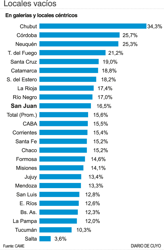 Por el impacto de la pandemia y la caída en las ventas un estudio nacional indicó que en San Juan este año cerraron el 16,5% de comercios respecto a los existentes el año pasado, quedando ubicada la provincia por encima de la media nacional que registra una tasa de cierres de locales del 15,6%. El informe, que fue realizado por la Confederación Argentina de la Mediana Empresa (CAME), indica que San Juan está dentro de las 10 jurisdicciones más afectadas del país por la crisis que desató el coronavirus. Al mirar la región, esta provincia también es la más perjudicada en Cuyo ya que Mendoza tiene el 13,3 % de locales cerrados y San Luis, el 12,8%. Para este informe realizado entre el 1 y el 18 de diciembre, se relevaron en San Juan más de 750 locales ubicados en las principales calles del centro comercial capitalino, es decir, Libertador, Laprida, Mitre, Rivadavia, Santa Fe, Tucumán, Mendoza y General Acha. El 16,5% de ellos, es decir, 126 locales, están cerrados. Las galerías comerciales son las que resultaron más impactadas, con una tasa de cierre del 30,49%, mientras que en el rubro locales a la calle, el impacto fue menor, del 10,74% de locales cerrados. El informe no indica si los que cerraron se mudaron a zonas más baratas pero en las diferentes cámaras comerciales consultadas dicen que hay de todo: que están los que bajaron definitivamente las persianas, los que se mudaron a locales más económicos, y también los que pasaron a la informalidad y venden en su casa o por internet. Todos los referentes comerciales además coinciden que los rubros más afectados son los de vestimenta y calzados. "En el caso de las galerías, esos números de los que cerraron son ciertos. Tengo entre un 30 a 35% de locales desocupados", dijo Carlos Iramain, que maneja 85 locales en total en la ciudad, 55 en la galería Central y 30 en el Paseo Unicentro (ex Factory). "Tuve que poner locales míos con ropa para ocupar espacios y que no se viera vacío, pero anda exactamente en esos números la cantidad que cerraron", dijo y agregó que hay casos que cerraron uno de dos locales y otros -la mayoría- que han cerrado definitivamente. Marcelo Vargas desde la Federación Económica -la entidad que colaboró para hacer el relevamiento local para la CAME-, dijo que la pandemia afectó mucho, sobre todo a los comercios que ya venían golpeados de antes por la caída de ventas. Opinó que una buena parte de los que cerraron han pasado a la informalidad, con tiendas de ropa que empezaron a vender por internet o con un bolsito en la calle, y también se da el caso de los que se han achicado, cerrando sucursales. Hermes Rodríguez, desde la Cámara de Comercio de San Juan, consideró como probable que el número de cierres sea mayor en las zonas de mayor concentración comercial. Recordó que la entidad realizó un relevamiento en el mes de julio sobre la zona más poblada de comercios, que reveló un 23% de locales cerrados que a igual fecha del 2019. Dijo que para cerrar definitivamente un negocio (dar de baja el CUIT) "hay que pagar y muchos no lo hacen y eso no sale en las estadísticas", y agregó que la Subsecretaria de Trabajo no está trabajando a pleno tampoco, para saber quiénes cerraron definitivamente o se mudaron a otra zona. Por su parte, el presidente de Comerciantes Unidos, Marcelo Quiroga, consideró que las cifras de cierre en la realidad no son tan altas como indica la encuesta. "A diferencia de Buenos Aires y otras provincias, San Juan fue una de las primeras que volvió a abrir las puertas del comercio a cielo abierto, shopping y galerías, por lo cual no creo que la realidad sea tan pesimista", opinó. Quiroga estimó que el cierre de locales comerciales a la calle no supera el 10%, "ya que varios se reinventaron, o dejaron su local para ir a otro más chico, más económico"; mientras que el de locales en galerías es del 15% a su juicio, la mitad de lo que dice CAME, "gracias a que se llegó a un acuerdo con los propietarios para bonificar alquileres".