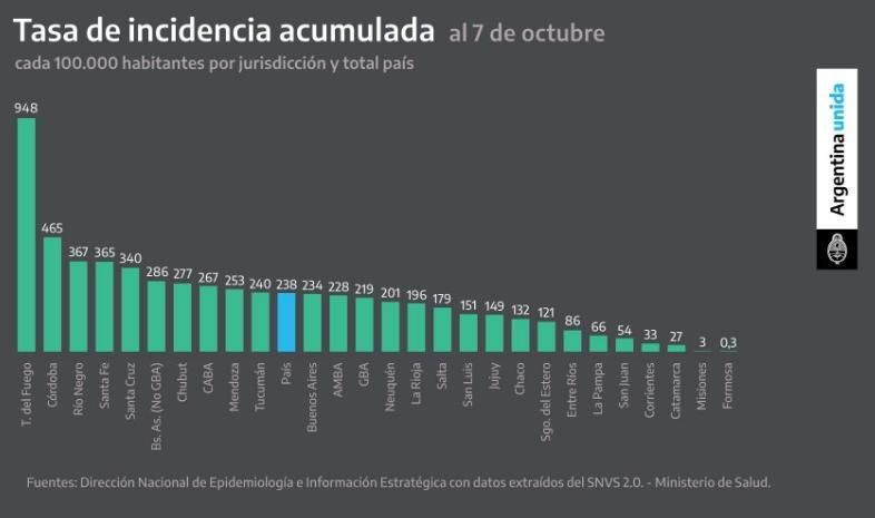 De igual forma, la provincia tiene una de las tasas de incidencia acumuladas (casos cada 100.000 habitantes) mas bajas del país.