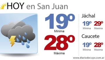 San Juan.- Según el pronóstico de hoy la máxima no superará los 28 grados con viento del Este por la mañana que luego rotará al Sur con algunas ráfagas. Además, continúa la amenaza de lluvias y tormentas para las últimas horas de este martes.